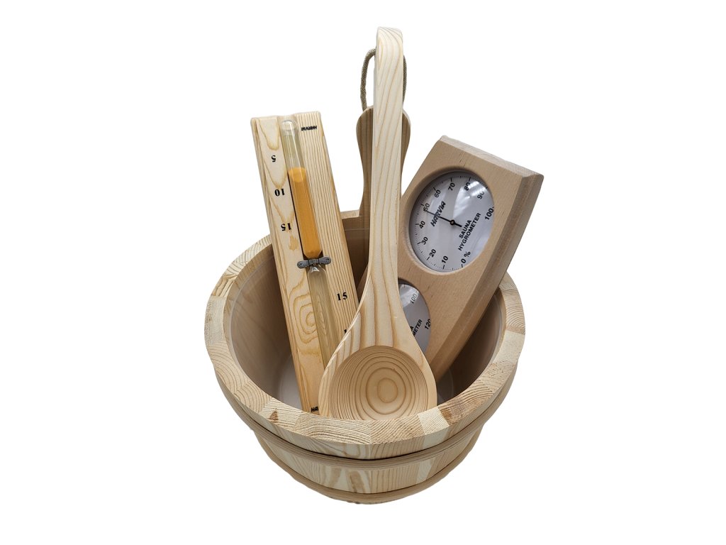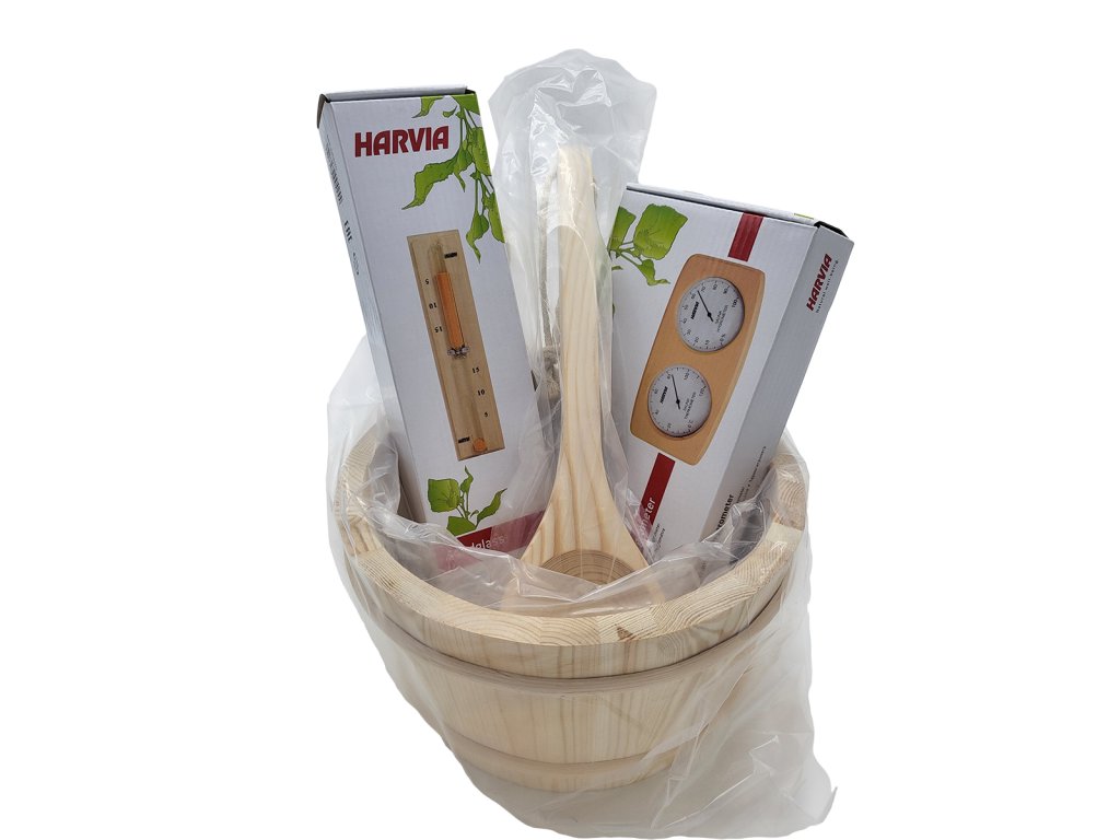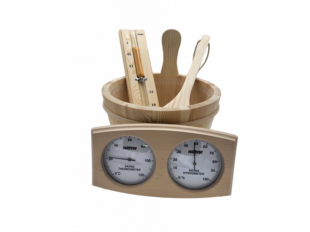 Saunové dřevěné vědro 4l s plast. vložkou, zabraňující protékání, dřevěná naběračka, Harvia přesýpací hodiny 15 min. Harvia teploměr s vlhkoměrem, saunová esence 115 ml.