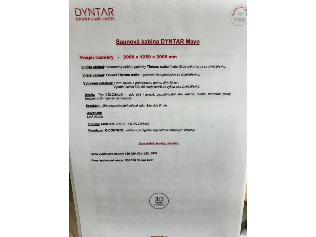 Objevte luxusní saunovou kabinu DYNTAR Mayo – originální design české výroby, který spojuje moderní eleganci s prvotřídními materiály. Nová kabina vystavená v showroomu je ihned k odběru, včetně montáže a dopravy po celé ČR. Dopřejte si wellness zážitek přímo u vás doma.