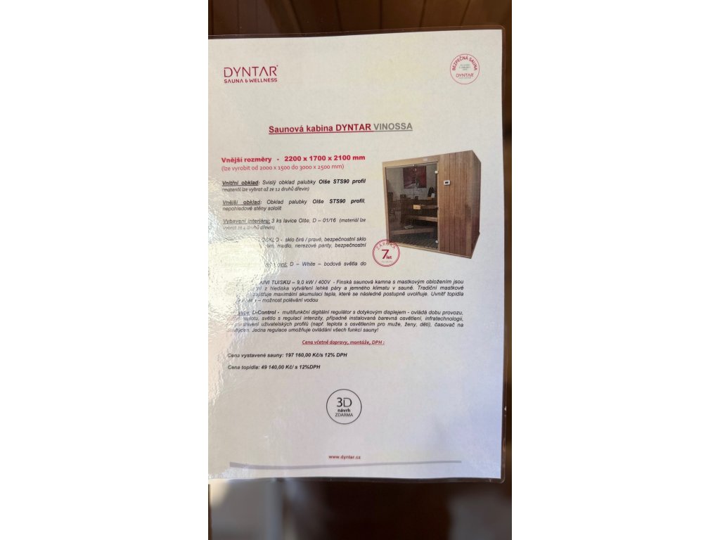 Cena vystavené sauny je 197.160 kč včetně montáže a dopravy a včetně 12% DPH.