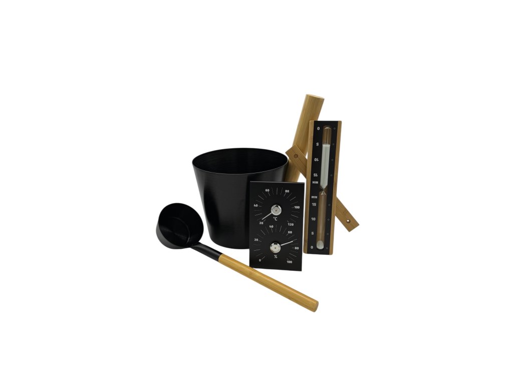Saunový set – hliníkové vědro černé + naběračka + teploměr + vlhkoměr + přesýpací hodiny